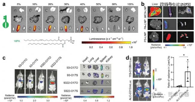 對比9A1P9和10A1P16制劑,后者顯示出更佳的遞送效率,能夠轉(zhuǎn)染約30%的巨噬細胞和6%的B細胞。用磷脂酰絲氨酸(PS)替代DOPE,可以將肝臟靶向轉(zhuǎn)移至脾臟,蛋白表達比例由8:1變?yōu)?:3。此外,將PS添加到基于MC3的Onpattro LNP中,可使其靶向淋巴結(jié)和脾臟(圖2b)。