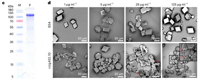 d. 在體外對(duì) ctg452.10 蛋白的功能驗(yàn)證。掃描電鏡圖像顯示了在不同濃度的牛血清白蛋白(BSA)和重組 ctg452.10 蛋白(rctg452.10)條件下碳酸鈣晶體的沉淀情況。紅色箭頭表示 ctg452.10 蛋白形成絲狀纖維。