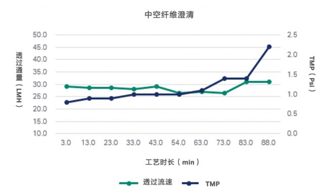 澄清工藝:采用Hollow Fiber進行澄清具有低剪切力的優(yōu)勢,選用0.65 μm的中空纖維柱進行澄清。在澄清工藝中特別是對透過通量進行了研究,從圖4中可以看到透過通量保持穩(wěn)定,工藝過程中跨膜壓也較低。經(jīng)優(yōu)化,澄清步驟回收率顯著提高。