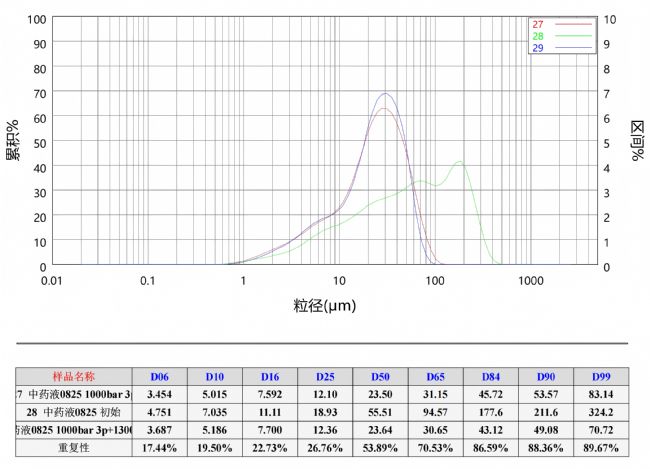 我們用ATS高壓均質(zhì)機(jī)對(duì)中藥提取液進(jìn)行處理。在設(shè)定的壓力下進(jìn)行多輪循環(huán)均質(zhì)后,藥液中原本粗大的顆粒被有效細(xì)化,體系趨于均一穩(wěn)定,透光率提升,流動(dòng)性增強(qiáng),口感也得到顯著改善。實(shí)驗(yàn)數(shù)據(jù)顯示,經(jīng)多級(jí)均質(zhì)處理的效果最好,D50達(dá)到了23.64 μm,粒徑更均一,有效成分的溶出速率與生物利用度明顯提高。