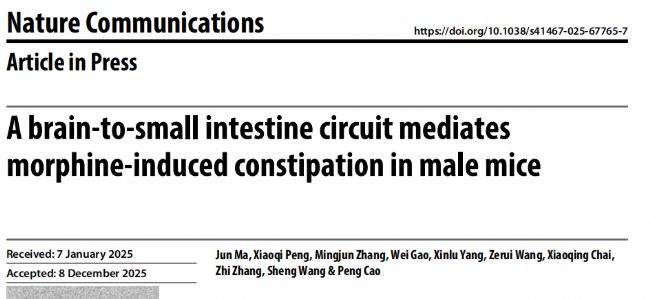 2025年12月23日,中國科學(xué)技術(shù)大學(xué)生命科學(xué)與醫(yī)學(xué)部張智/曹鵬團(tuán)隊,聯(lián)合中國科學(xué)技術(shù)大學(xué)第一附屬醫(yī)院麻醉科柴小青/王勝團(tuán)隊,在嗎啡致便秘的神經(jīng)機(jī)制研究中取得重要進(jìn)展,成果以“A brain-to-small intestine circuit mediates morphine-inducedconstipation in male mice”為題發(fā)表于Nature Communications,發(fā)現(xiàn)一條從中樞到小腸的關(guān)鍵神經(jīng)環(huán)路介導(dǎo)OIC,為治療嗎啡引起的便秘提供了理論依據(jù)和干預(yù)靶點(diǎn)。